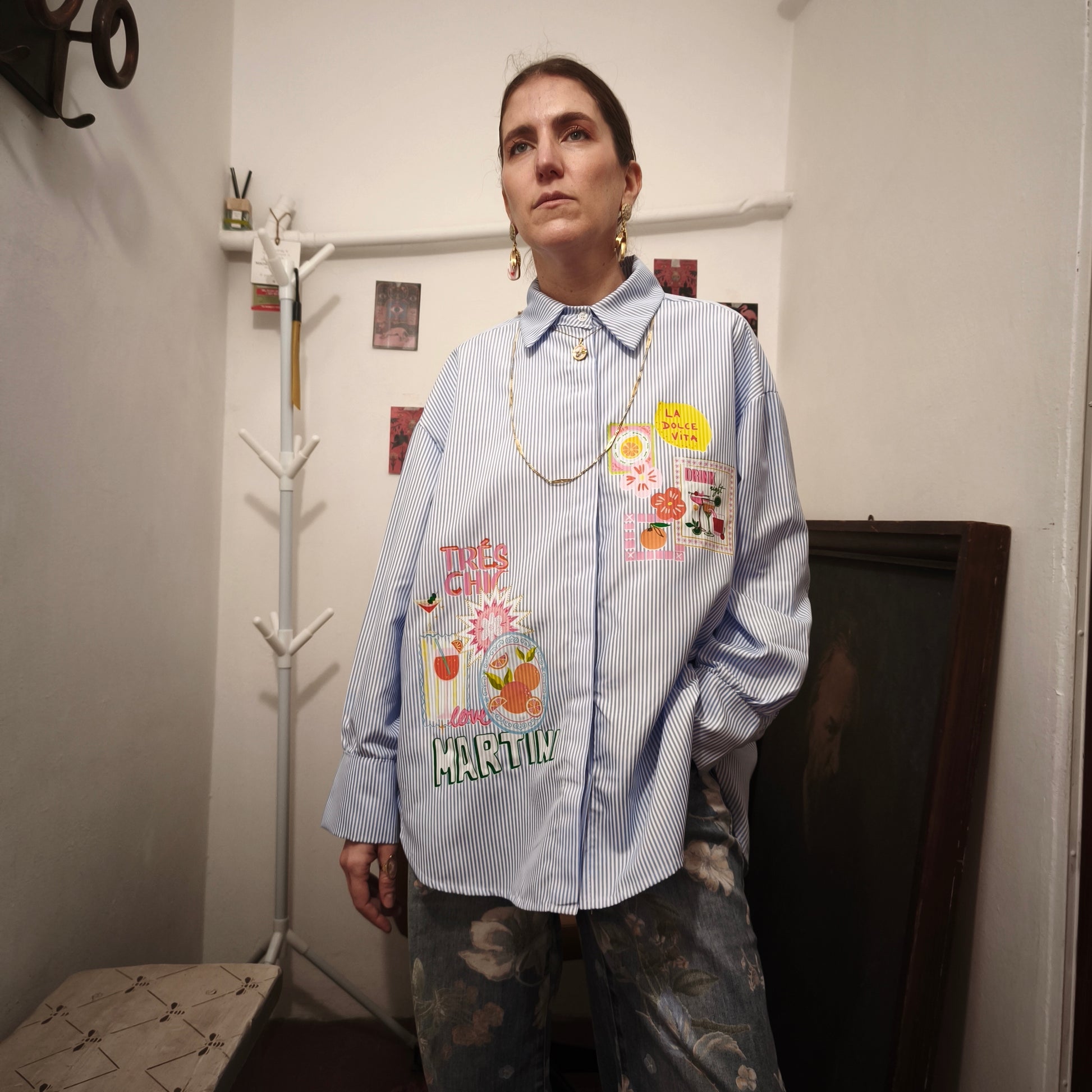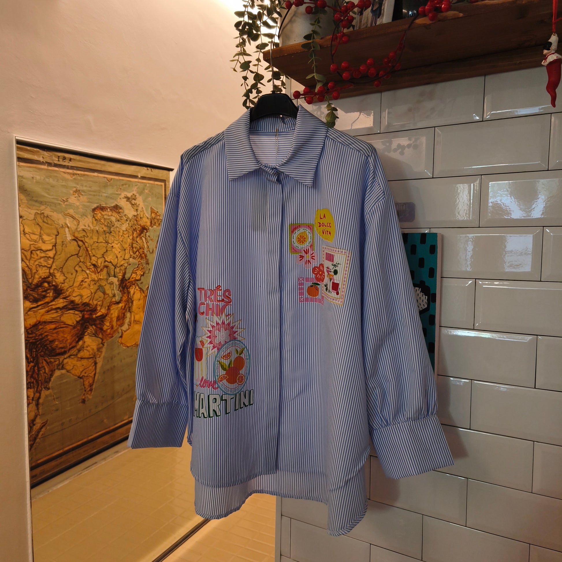 Maxi camicia a righe con stampe, asimmetrica e taglia unica (38/40)